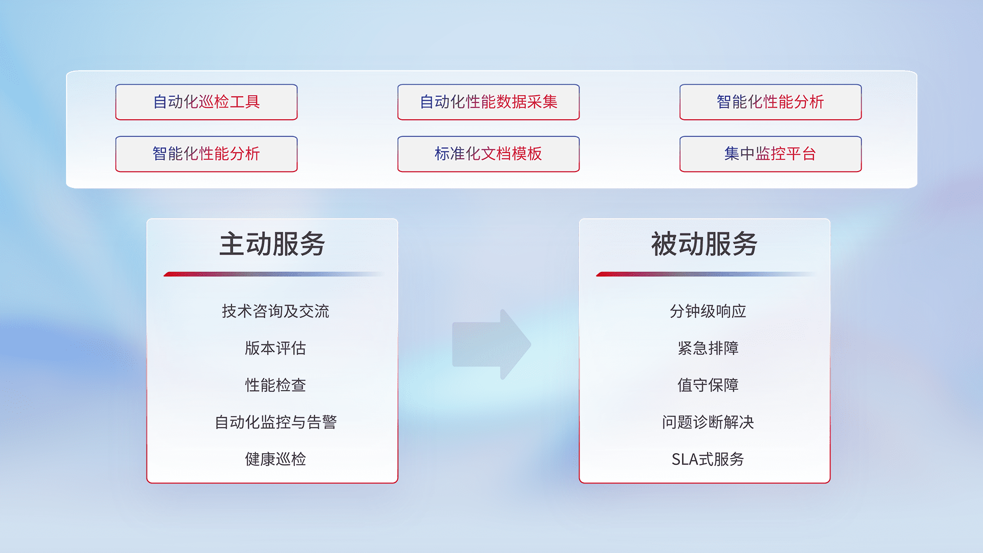 智能化工具和标准化文档,,,,保障服务质量,,,,提供主动服务(包含技术咨询、、版本评估、、、性能检查、、、自动化监控与告警、、、健康巡检)和被动服务包含(分钟级响应、、、紧急排障、、值守保障、、问题诊断解决、、、、SLA服务)。。。